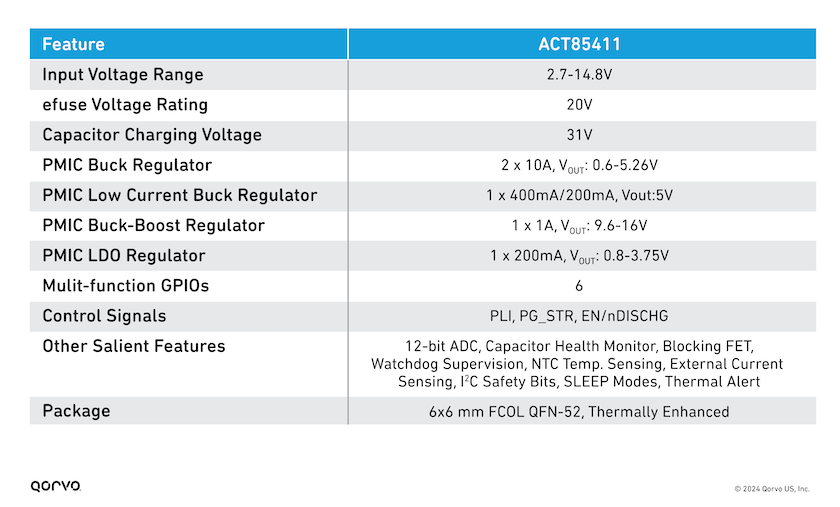 The features of Qorvo’s PMIC devices vary to cater to diverse system requirements. The ACT85611 includes four efficient buck regulators (three 4 A and one 2 A) with output voltages from 0.6 V to 5.26 V, a low current buck regulator (Buck VCC) for internal circuitry and external loads up to 100 mA, an LDO with 300mA capacity and adjustable voltage from 0.6 V to 3.75 V, and a 1 A boost regulator offering 10.8 V to 13.2 V output. The ACT85411 features two 10A buck regulators with a 0.6 V to 5.26 V output range, a low current 5 V fixed buck regulator (VCC5) for internal and external loads up to 200 mA, and a 1 A buck-boost regulator with a 9.6 V to 16 V output range.