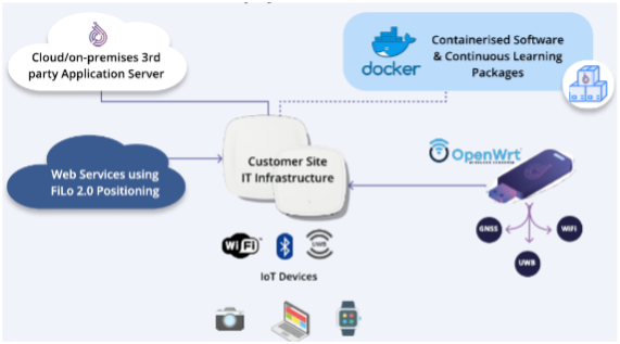 The FiLo indoor location service can be easily and economically deployed as an overlay on enterprise IT infrastructure such as Wi-Fi Access-Point indoor deployments, where FiLo USB dongles augment the Wi-Fi APs with UWB and GNSS for fine-grained indoor accuracy and automated geo-fixing.